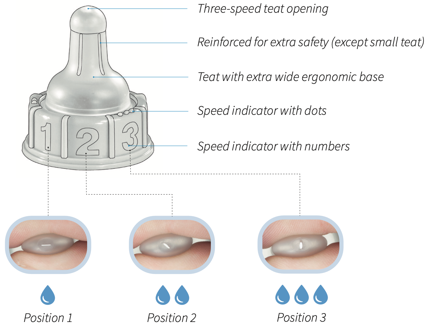 - Ergonomic: wide teat base